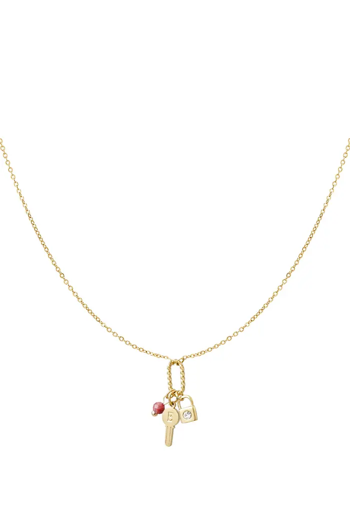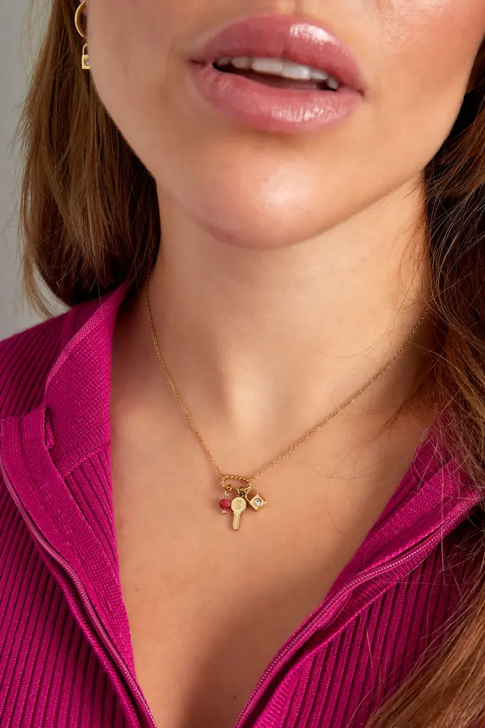 Goudkleurige kettinkje met ringetje met daaraan een slotje, sleuteltje en roze steentje